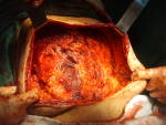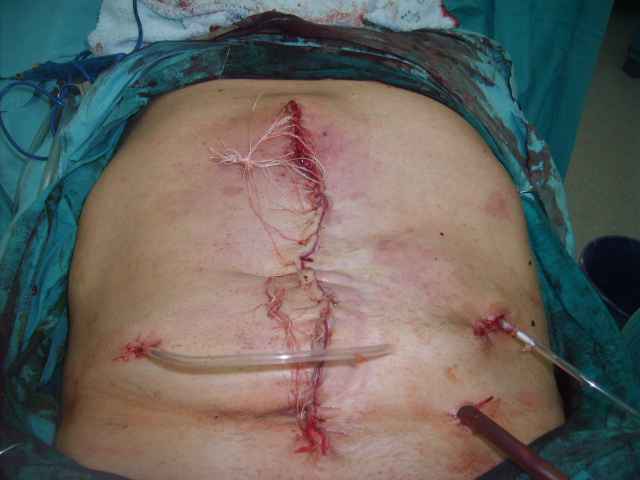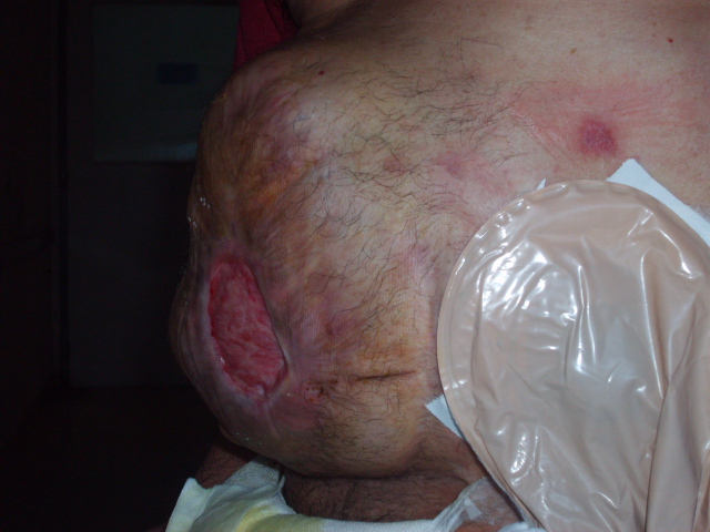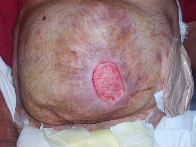 Paciente de 62 años que fue intervenido hace dos años por vólvulo de sigmoides necrosado, al que se le practicó una intervención de Hartman ( colostomía sigmoidea y muñón rectal). Tuvo un post-operatorio complicado por dehiscencia del muñon rectal con peritonitis fecal. Se reintervino dejando el abdomen abierto y contenido y cicatrización por segunda intención. Fue dado de alta con curas de la herida quirúrgica , que en la actualidad está como se puede apreciar en la fotografía.