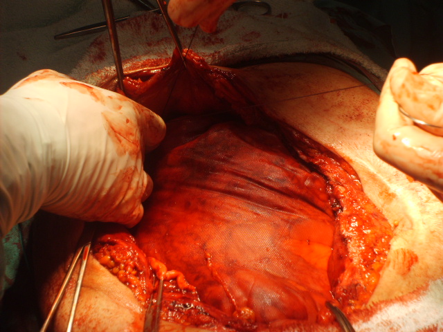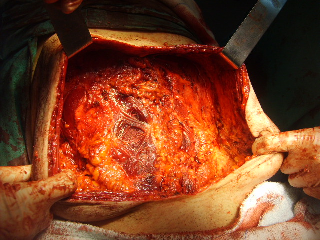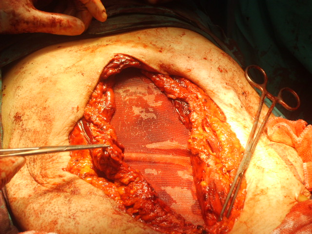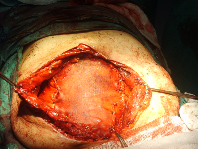 Una vez preparado el paciente, se abordo por vía anterior con resección de cicatriz. Se procedió a descolgar la colostomía y a una anastomosis mecánica transanal. Se Dreno cavidad abdominal y se procedió a la apertura de la hoja posterior de ambos musculos rectos.. Se ubico una primera prótesis de 30cmm x 30 cmm de Vicry intraperitoneal y suturada a la hoja posterior de la vaina de los rectos., cubriendo todo el defecto. A continuación y por detras de los rectos se interpuso un prótesis de polipropileno 30cm x 30 cm, fijada al plano aponeurótico con material de reabsorción lenta. Dos incisiones de descargas a ambos lados en el oblicuo mayor se realizaron a continuación como lo describiera Albanese en nuestro país.Las mismas partian desde el reborde costal hasta abajo. y luego se completo con incisiones de descargas alternadas en la hoja anterior de las vaina de ambos rectos, lo que permitió la aproximación del complejo recto-oblicuo menor tranverso para cubrir la protesis de prolene Se colocaron dos drenajes en celular subcutáneo.. El enfermo cursa un postoperatorio satisfactorio con buena evolución a la fecha.