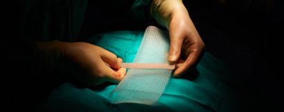 Evaluación Malla bien posicionada 1 mediante TAC 3D (Dr. Torregrosa Gallud) Visión Coronal Oblicua de Máxima Intensidad donde se aprecia la malla perfectamente extendida cubriendo el Orificio Miopectíneo.