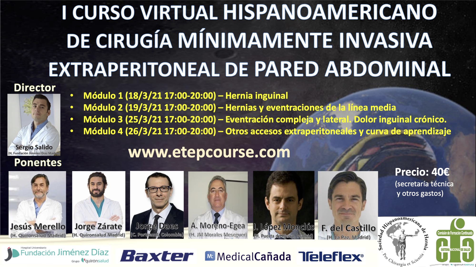 Gran calidad e impacto docente, con la participación de destacados cirujanos hispanoamericanos. La Cirugía Endoscópica de la Pared a su alcance, todas las técnicas actuales en un estudiado programa, muy práctico con posibilidad de trabajo y participación on line con repaso de las clases en diferido. La Sociedad Hispanoamericana de Hernia auspicia este magnífico Curso e invita a participar a todos sus socios y cirujanos afines.