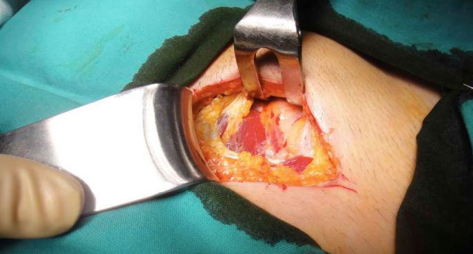 Técnica de Nyhus modificada en hernia inguinal derecha directa. Prótesis DynaMesh®-Lichtenstein (PVDF)
